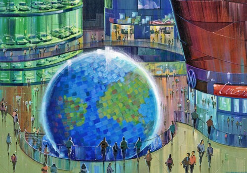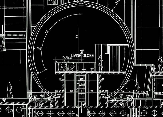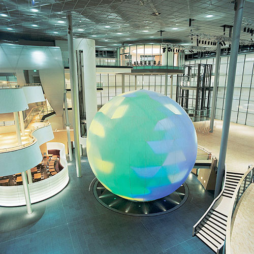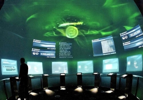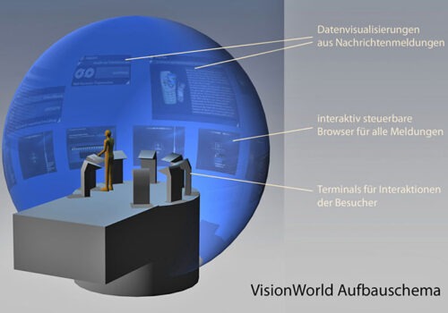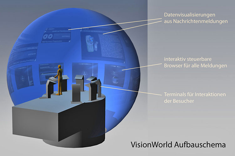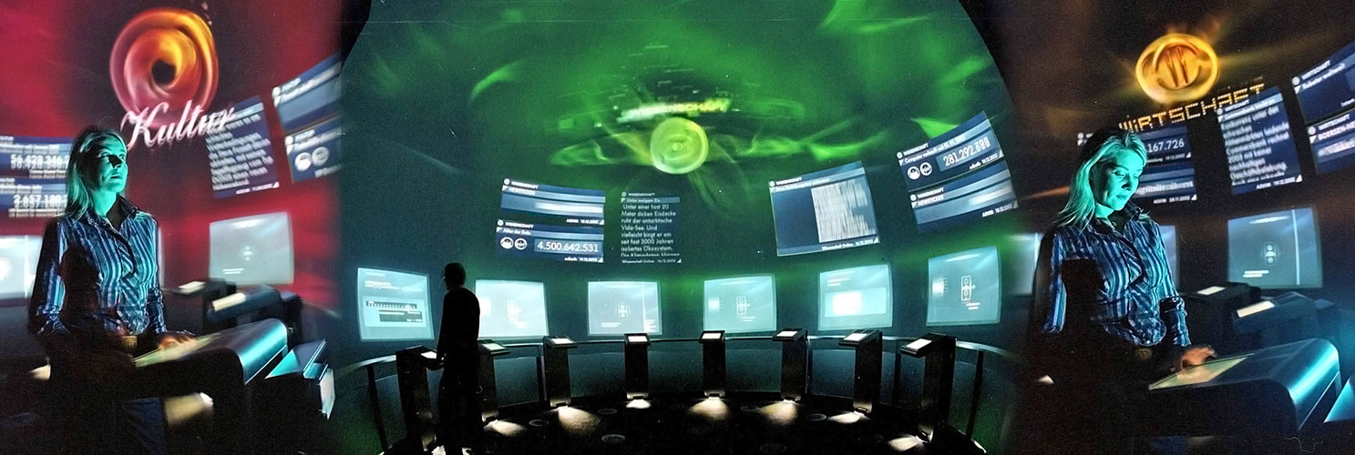 Innerhalb der Kugel befindet sich eine Projektion, die 270° in der Horizontalen und gut 180° in der Vertikalen füllt. Die Gesamtauflösung beträgt ca. 6.000 x 4.000 Bildpunkte. Fünf thematische Clips wechseln sich hier ständig ab. Auf halber Höhe befindet sich ein umlaufender Bereich, in den wechselnd unterschiedliche Fenster eingeblendet werden. In den Fenstern sind Texte und Bilder zu sehen sowie laufende Ticker, die über aktuelle Geschehnisse aus Wirtschaft, Politik, Wissenschaft und Kultur berichten. Im unteren Bereich befinden sich zusätzliche Fenster. Diese gehören zu jeweils einem der acht Touchscreen Kioske für die Besucher. Hier kann jeder Besucher individuell, aber sichtbar für alle anderen in den aktuellen Informationen blättern.