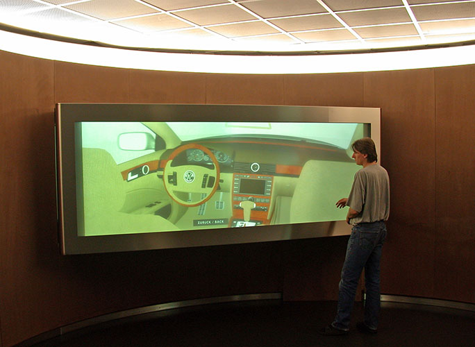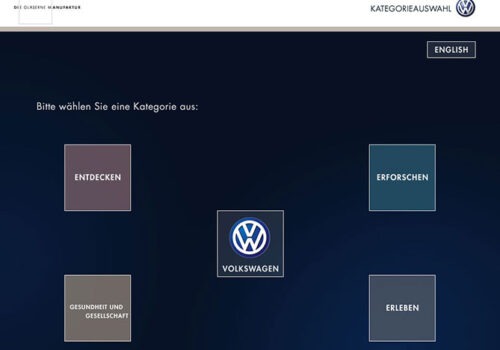 Das Kugelhaus ist mit acht interaktiven Touch-Terminals ausgestattet, die es dem Besucher erlauben, die täglichen Updates der dynamischen, datenbankgesteuerten, weltweiten News zu erkunden, welche die globale Vernetzung des Unternehmens Volkswagen AG symbolisieren.