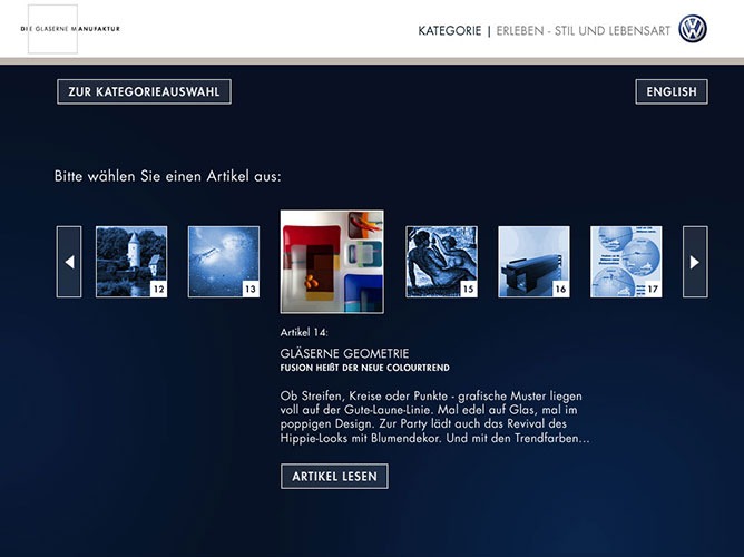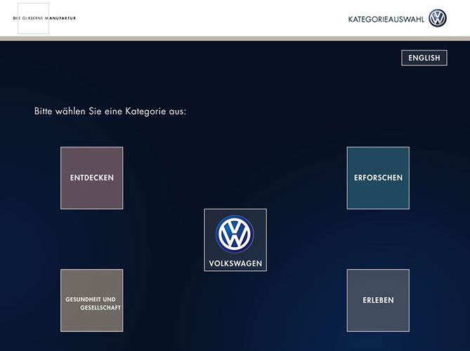 project: syntropy war Partner für den Relaunch und die Weiterentwicklung verschiedener Attraktionen im Eventbereich der Gläsernen (Phaeton-) Manufaktur von Volkswagen in Dresden. Wir übernahmen die Erneuerung der Hard- und Software sowie der interaktiven Anwendungen der 12 Meter großen 360°-Kuppelprojektion im sogenannten Kugelhaus (vormals Vision World, eine Reminiszenz an das erste je gebaute Kugelhaus, das an gleicher Stelle stand) und gestalteten den interaktiven Echtzeit-3D Car-Konfigurator mit Fotostation, mit dem sich jeder Besucher eine personalisierte Postkarte mit Lieblings-Phaeton erstellen konnte.