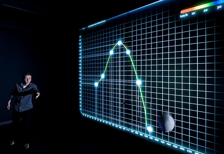 Dieser Experimentierraum veranschaulicht, dass die Wurfbahn eines Objekts immer eine Parabel beschreibt, gleichgültig wie hoch oder wie weit man einen Ball wirft. Auf der Projektionsfläche wird jeder Ballwurf mittels Echtzeitgrafik nachgezeichnet. Die Farbigkeit der Flugbahnen demonstriert gleichzeitig die Geschwindigkeit des Balls im Flug. Ein Auswertungsfenster gibt schlußendlich anhand einer „eingefrorenen“ Kurve dem Besucher Auskunft über seine erzielte Wurfgeschwindigkeit in cm/sek.