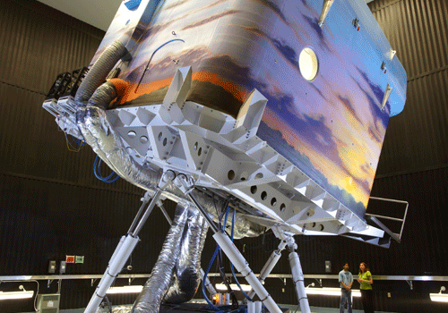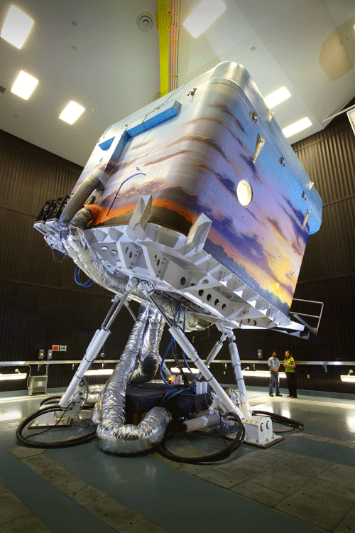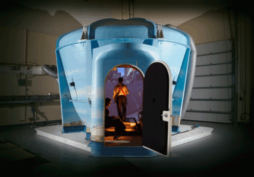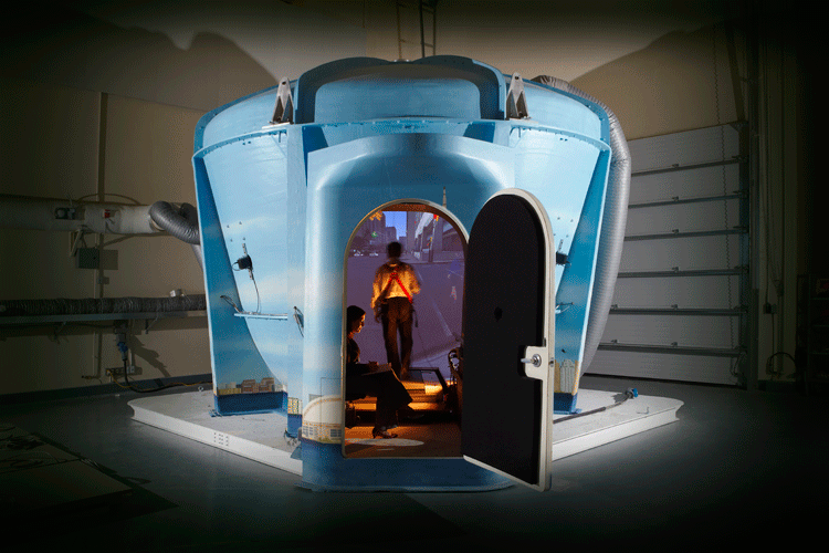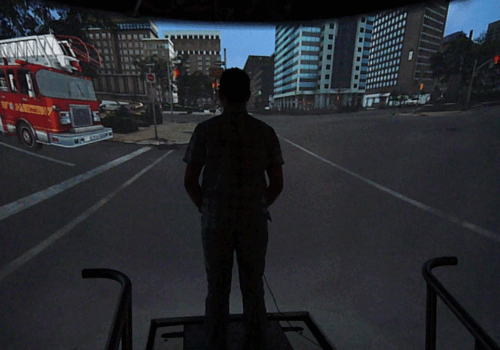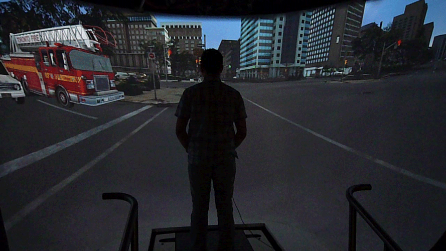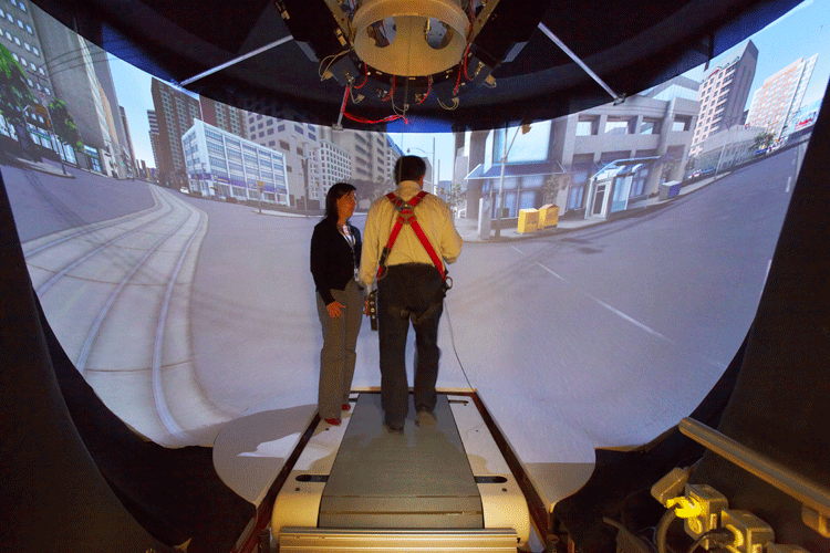 Die Bewegungsplattform mit sechs Freiheitsgraden kann mit drei verschiedenen Nutzlasten konfiguriert werden. Die Streetlab – Nutzlast beinhaltet eine gekrümmte Projektionsleinwand mit 180°-Sichtfeld, kombiniert mit einer Laufband-Schnittstelle und einem Rollstuhlsimulator. Das Sichtsystem selbst ist eine VR (Virtuelle Realität) – Hohlkehle, in der Menschen durch die virtuelle Innenstadt Torontos spazieren können, während ihre Aufmerksamkeit an belebten Kreuzungen und durch Hindernisse auf der Straße gefordert wird. project: syntropy wurde beauftragt, das komplette Projektionssystem für die VR-Hohlkehle zu entwickeln und zu liefern. Es ist ausgestattet mit fünf LED-Frontprojektionskanälen und einem LED-Bodenprojektionskanal einschließlich eines Autokalibrierungssystems von domeprojection.com. Die Integration und Ersteinmessung wurde in Kanada von uns durchgeführt.