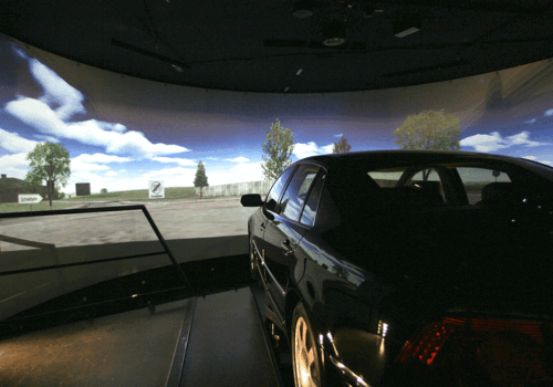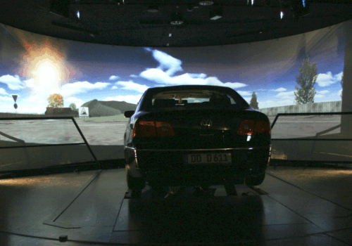 Als Partner für den Relaunch und die Weiterentwicklung verschiedener Attraktionen im Eventbereich der Gläsernen Manufaktur von Volkswagen wurde project: syntropy auch mit der Erneuerung des Sichtsystems des Fahrsimulators beauftragt. Das Sichtsystem bestand aus einer fünfkanaligen, 7m breiten 180° Zylinderprojektion im Portraitformat, ausgestattet mit projectiondesign Projektoren, einem 3D Warping & Blending System und einer Autokalibration. Bilderzeuger und Simulationssoftware wurden in Kooperation mit Krauss-Maffei Wegmann migriert. Der Simulator wurde in der Zwischenzeit im Zuge einer erneuten Umgestaltung der Event-Area abgebaut.
